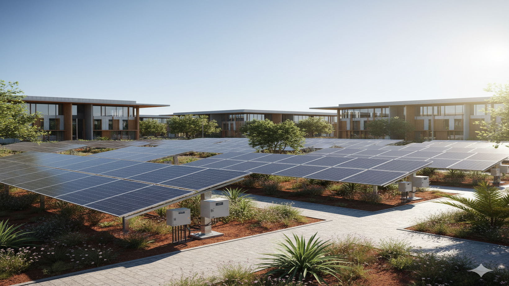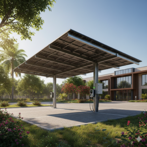 Ombrière solaire intelligente sur parking d’entreprise, combinant production d’énergie et protection des véhicules. Autoconsommation optimisée avec bornes de recharge électrique intégrées.